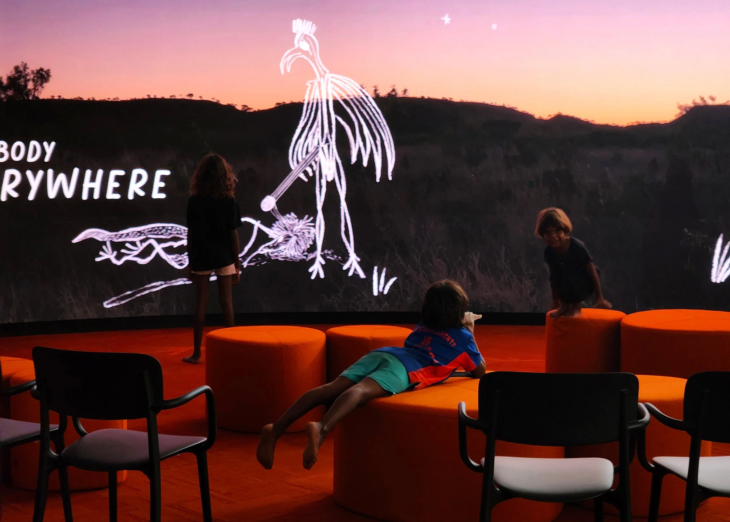The design was guided throughout by the Warumungu Community, incorporating into the exhibition a strong sense of being on Country and connecting to the footsteps of their ancestors who have always walked here.
